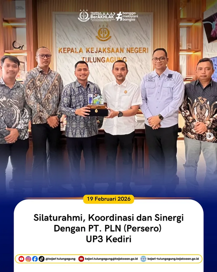 Kamis 19 Februari, Kepala Kejaksaan Negeri Tulungagung didampingi oleh Kepala Seksi Perdata dan Tata Usaha Negara menerima kunjungan Silaturahmi, Koordinasi dan Sinergi dari Manager PT. PLN (Persero) UP3 Kediri beserta jajaran Manager ULP area Kediri, Tulungagung dan Blitar guna meningkatkan dan memperkuat kolaborasi antar instansi.
