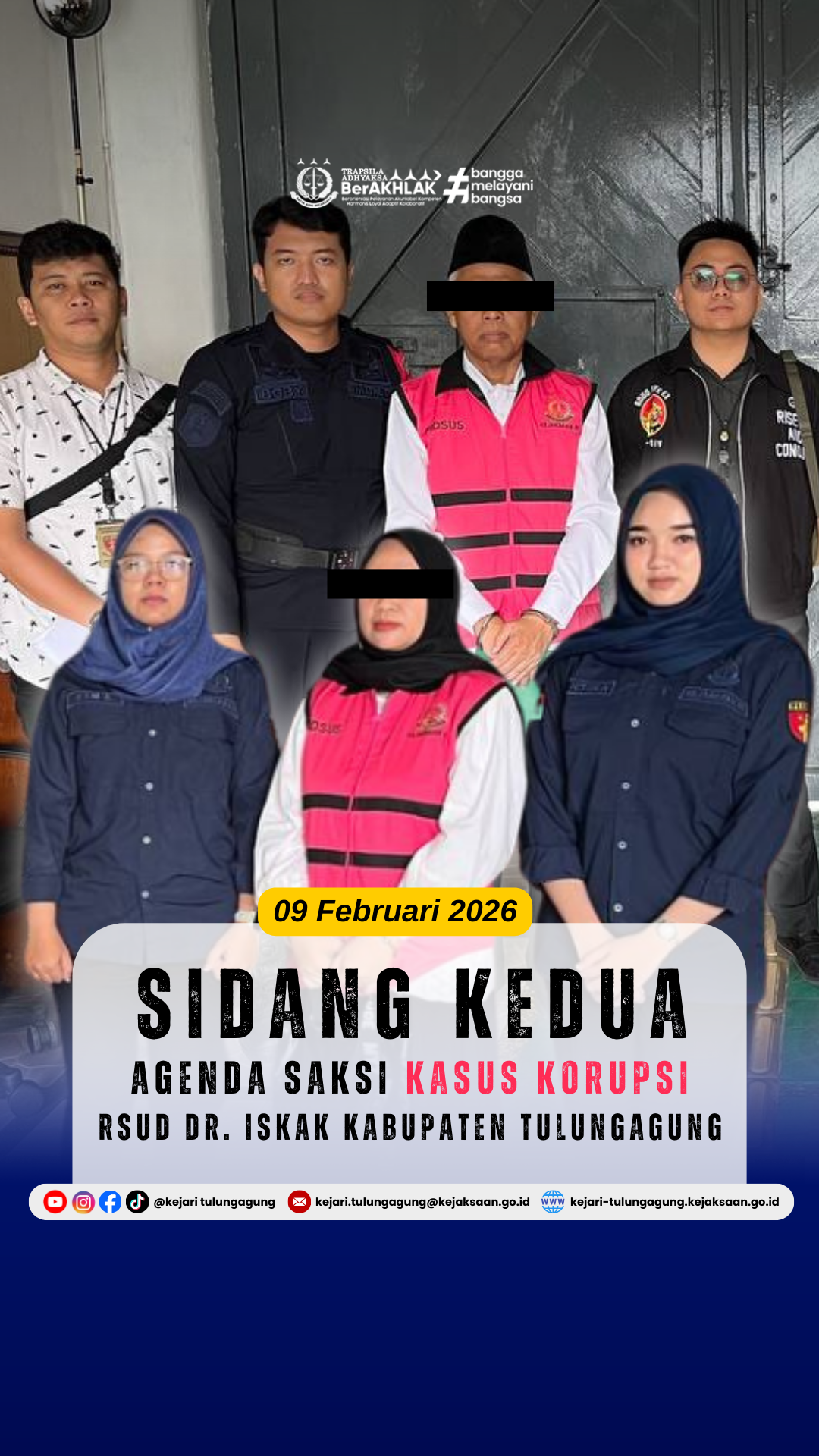 Senin (09/02/2026), Tim Jaksa Penuntut Umum (JPU) Kejaksaan Negeri Tulungagung yang dipimpin oleh Ibu Anik Partini, S.H., telah menghadiri sidang kedua perkara dugaan tindak pidana korupsi penyalahgunaan dana SKTM di RSUD Dr. Iskak Tulungagung.